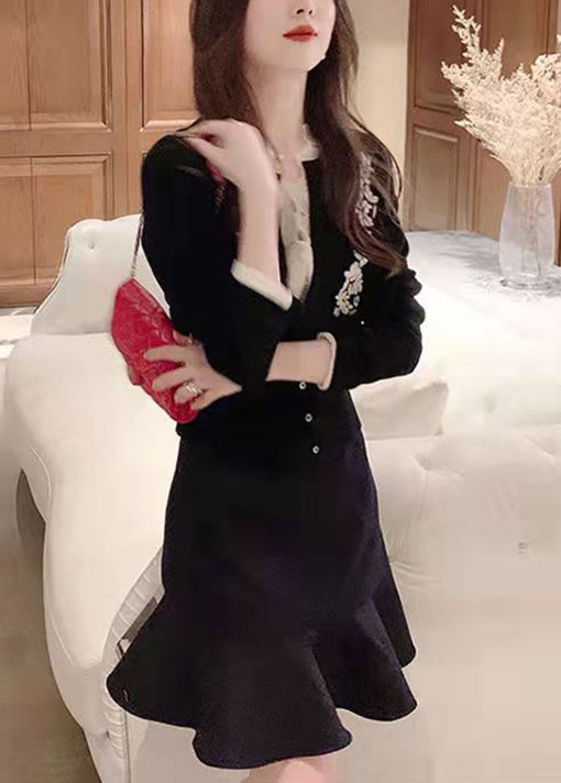 Italian Black Embroidered Button Patchwork Cotton Knit Cardigan Fall