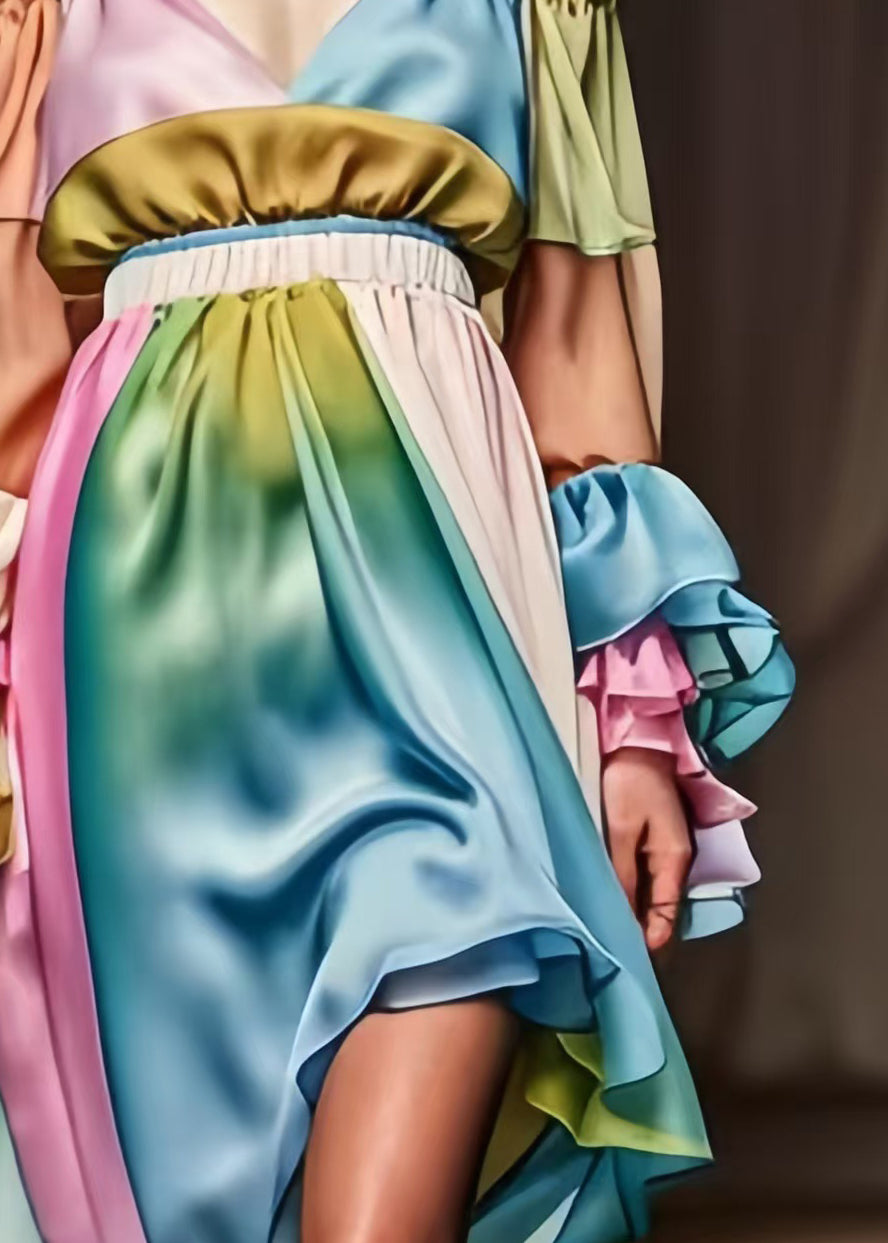 Italian Colorblock Cinched Patchwork Silk Cami Dress Lantern Sleeve