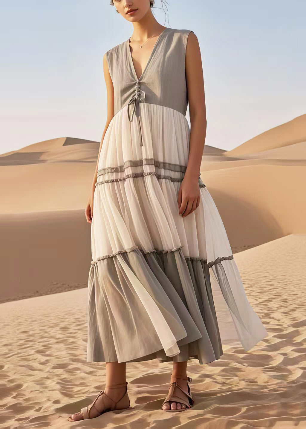 Italian Grey Cinched Patchwork Tulle Long Dress Sleeveless