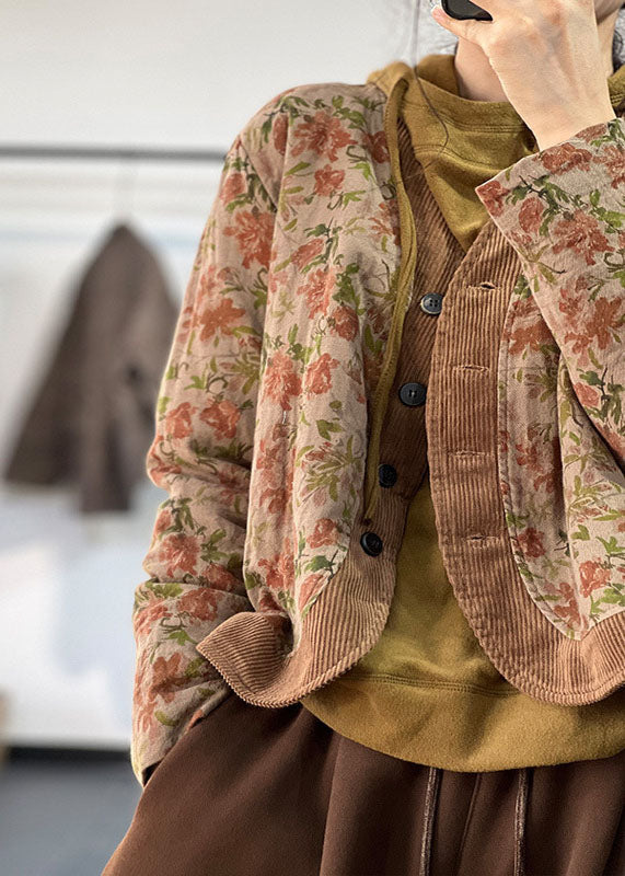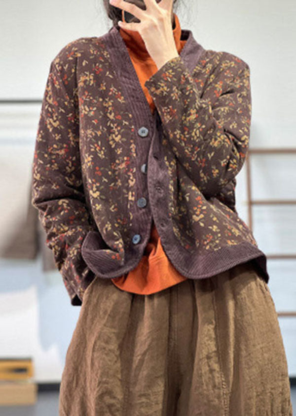 Italian Khaki V Neck Patchwork Print Fine Cotton Filled Witner Coat