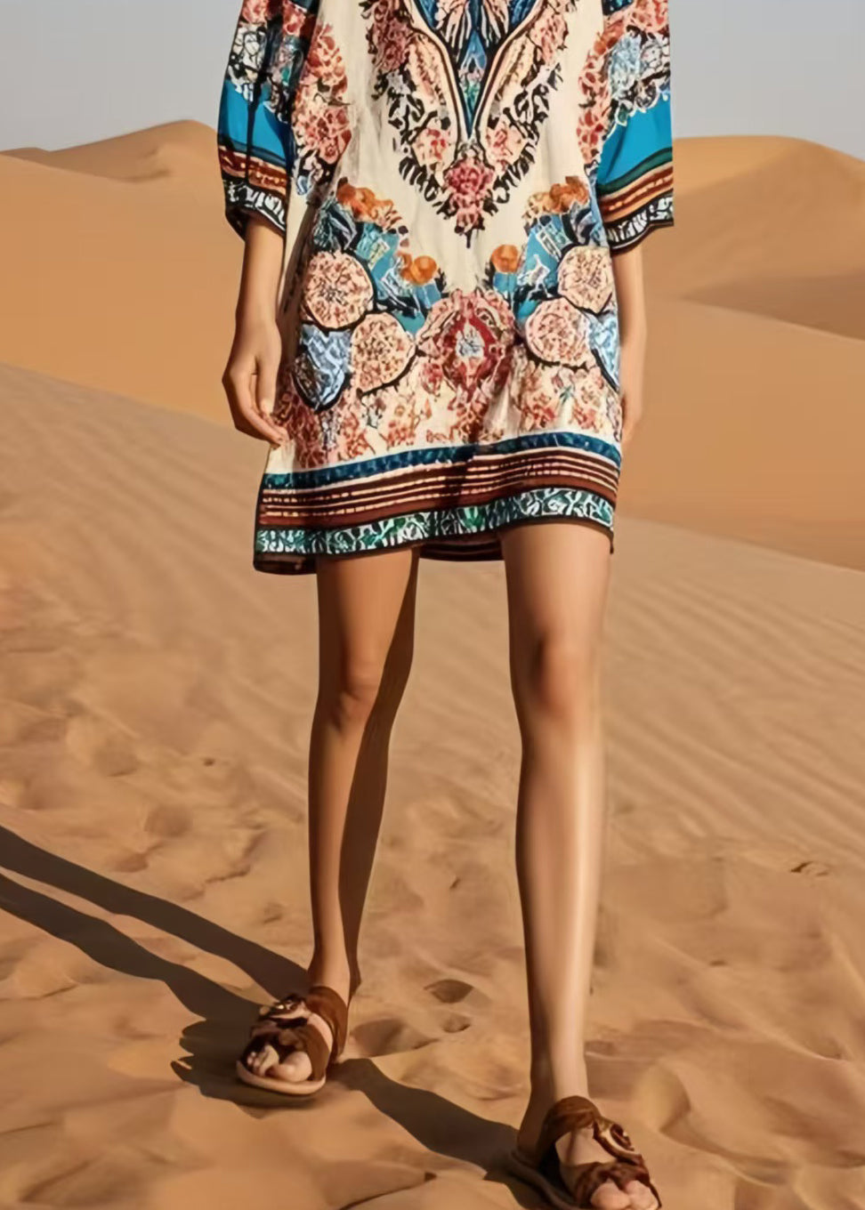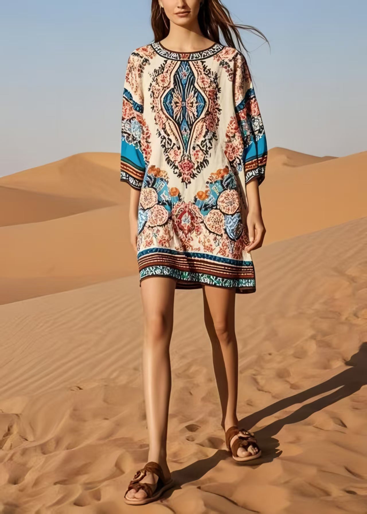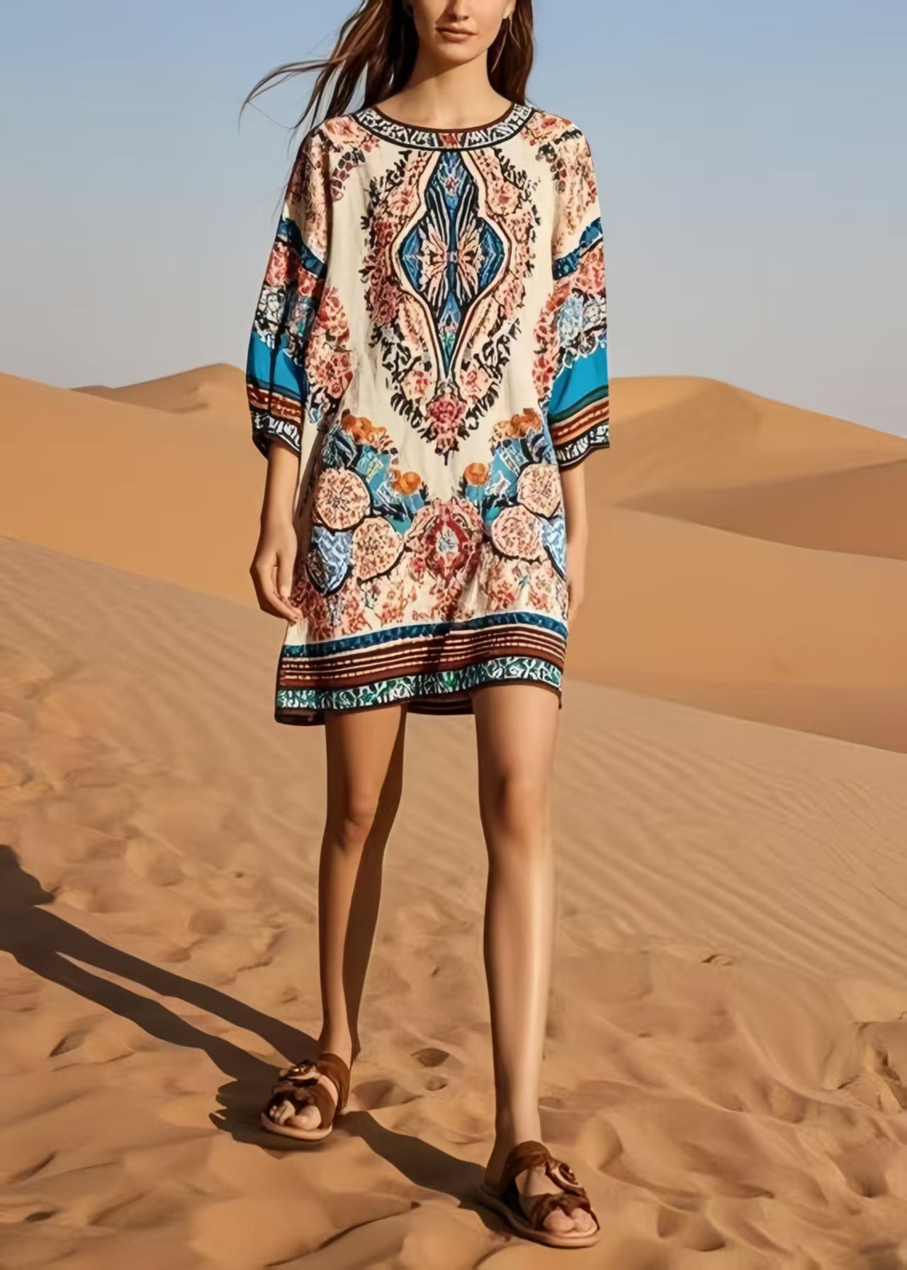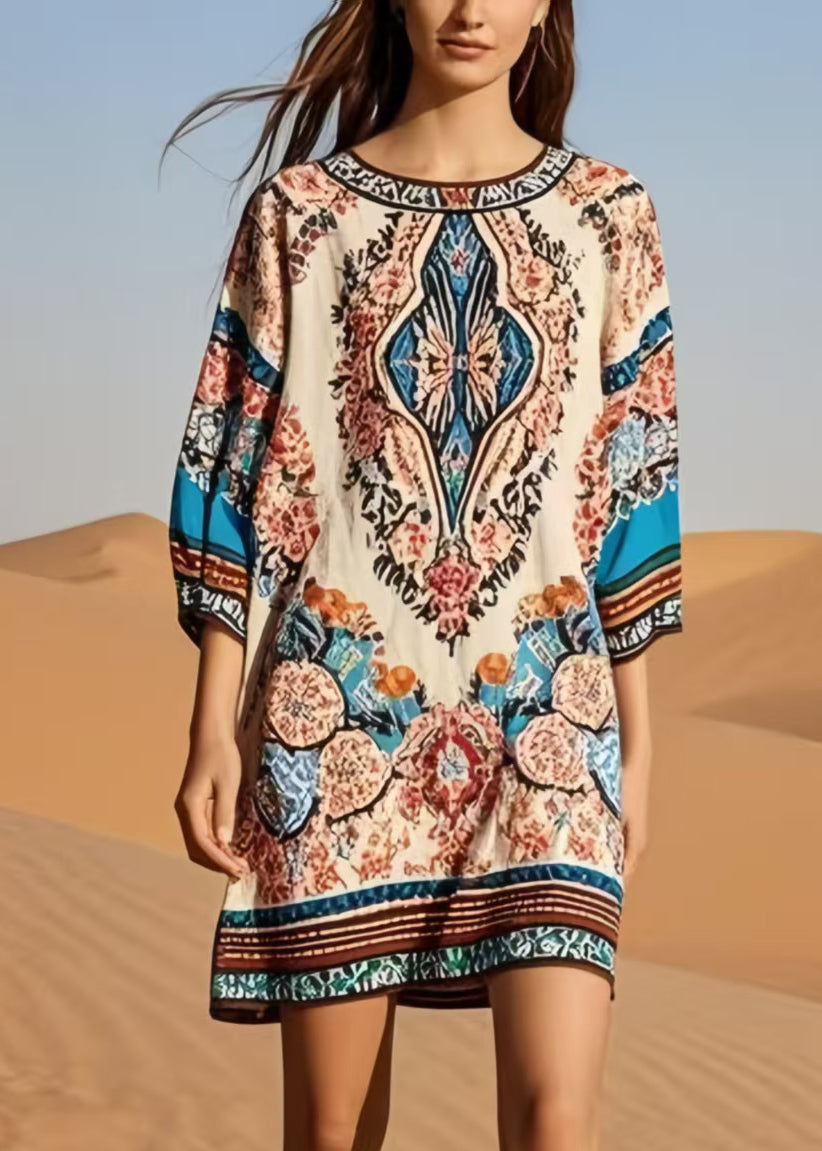 Italian O-Neck Print Cotton Tea Dress Bracelet Sleeve