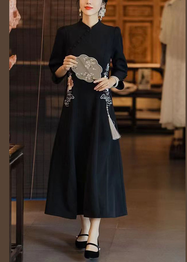 Italian Red Embroidered Button Side Open Silk Long Dresses Fall