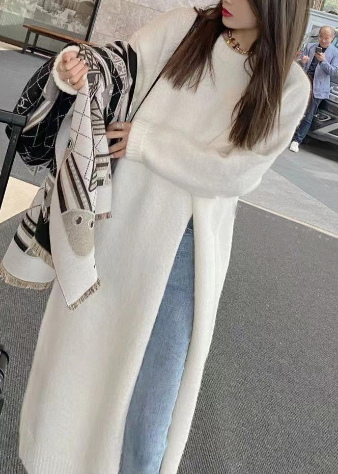 Italian White O Neck Side Open Patchwork Knit Sweaters Dress Fall