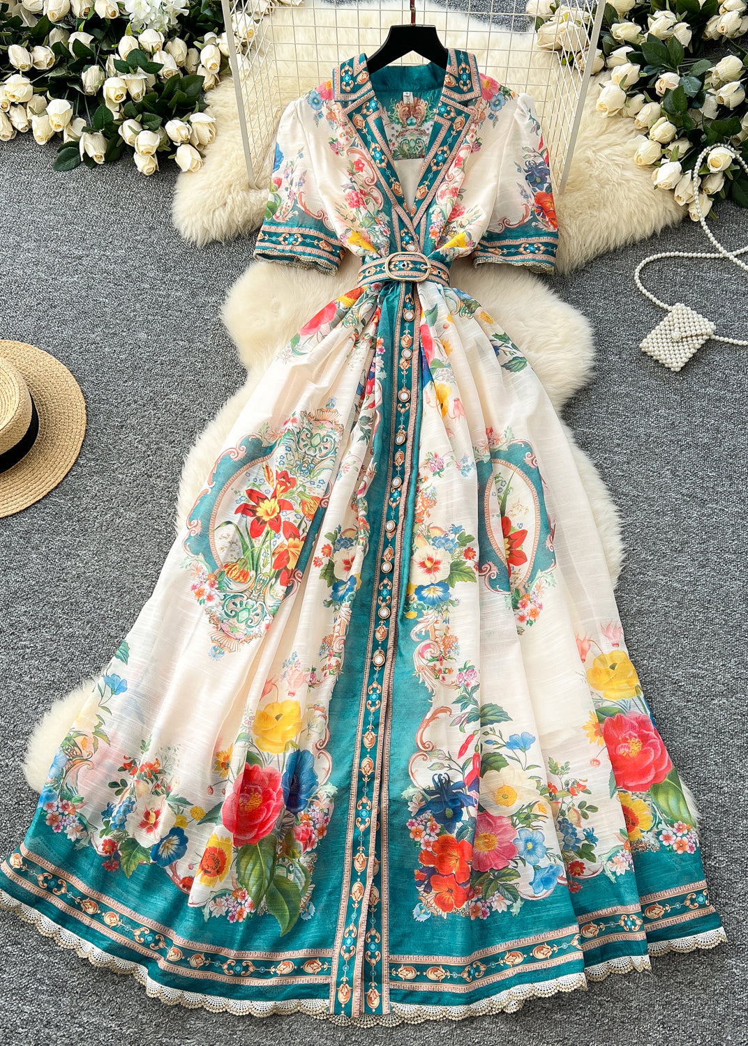 Italian Yellow Cinched Print Chiffon Long Dress Summer