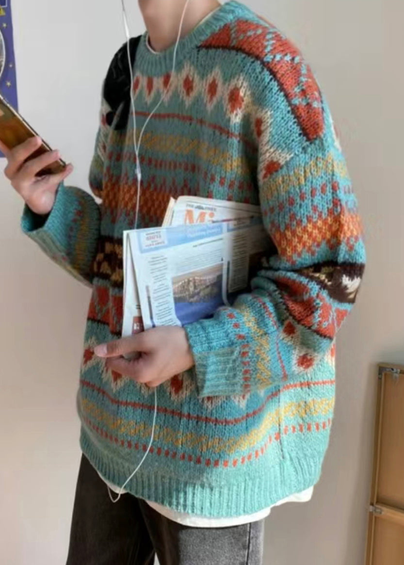 Jacquard Blue O Neck Cozy Knit Mens Sweaters Fall
