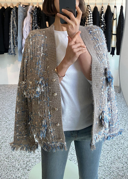 Khaki Tasseled Pockets Knitted Cotton Coat V Neck