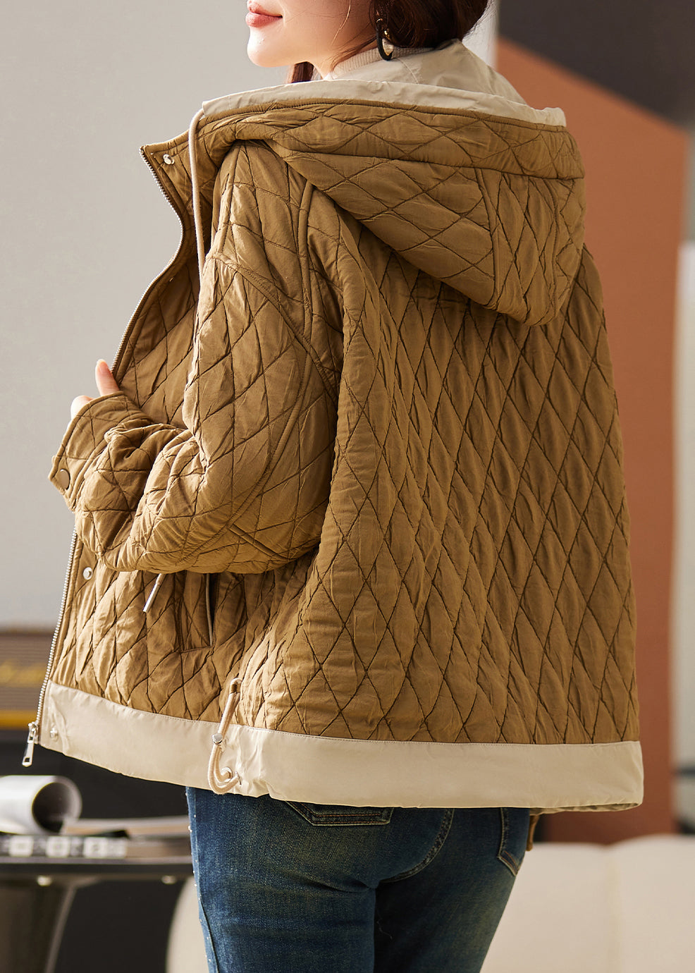 Loose Black Hooded Zippered Pockets Cotton Filled Coats Winter
