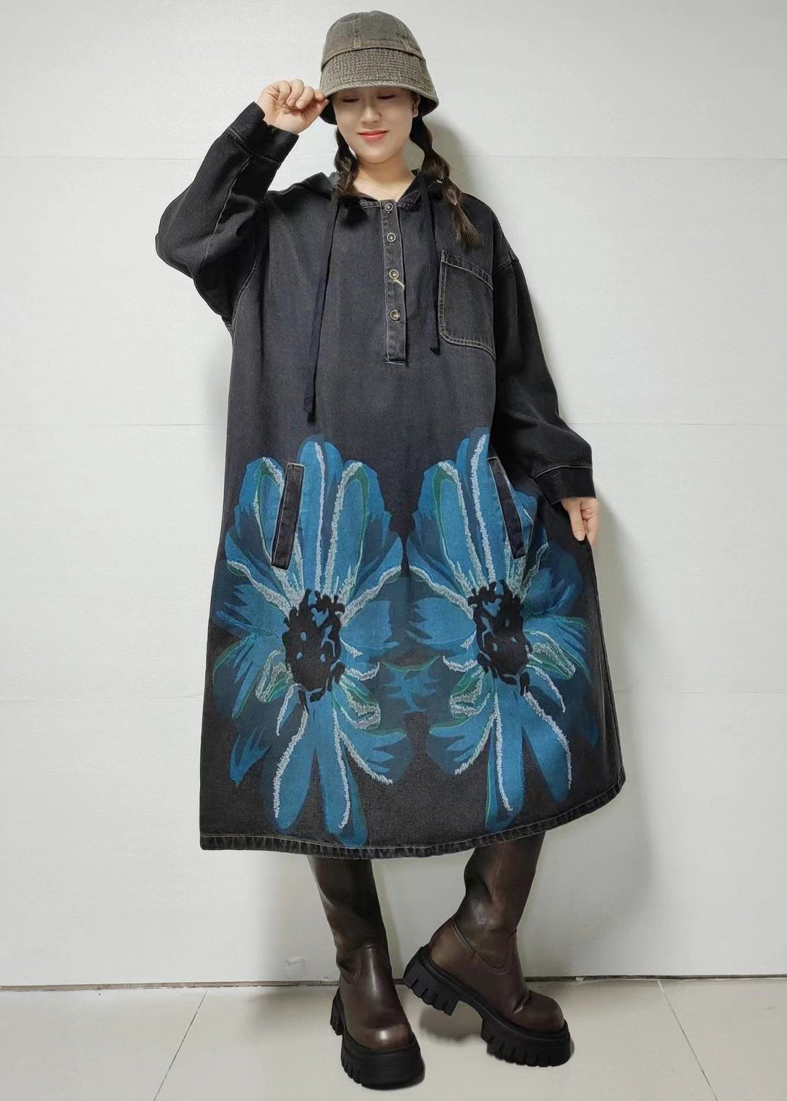 Loose Blue Hooded Print Denim Dress Long Sleeve