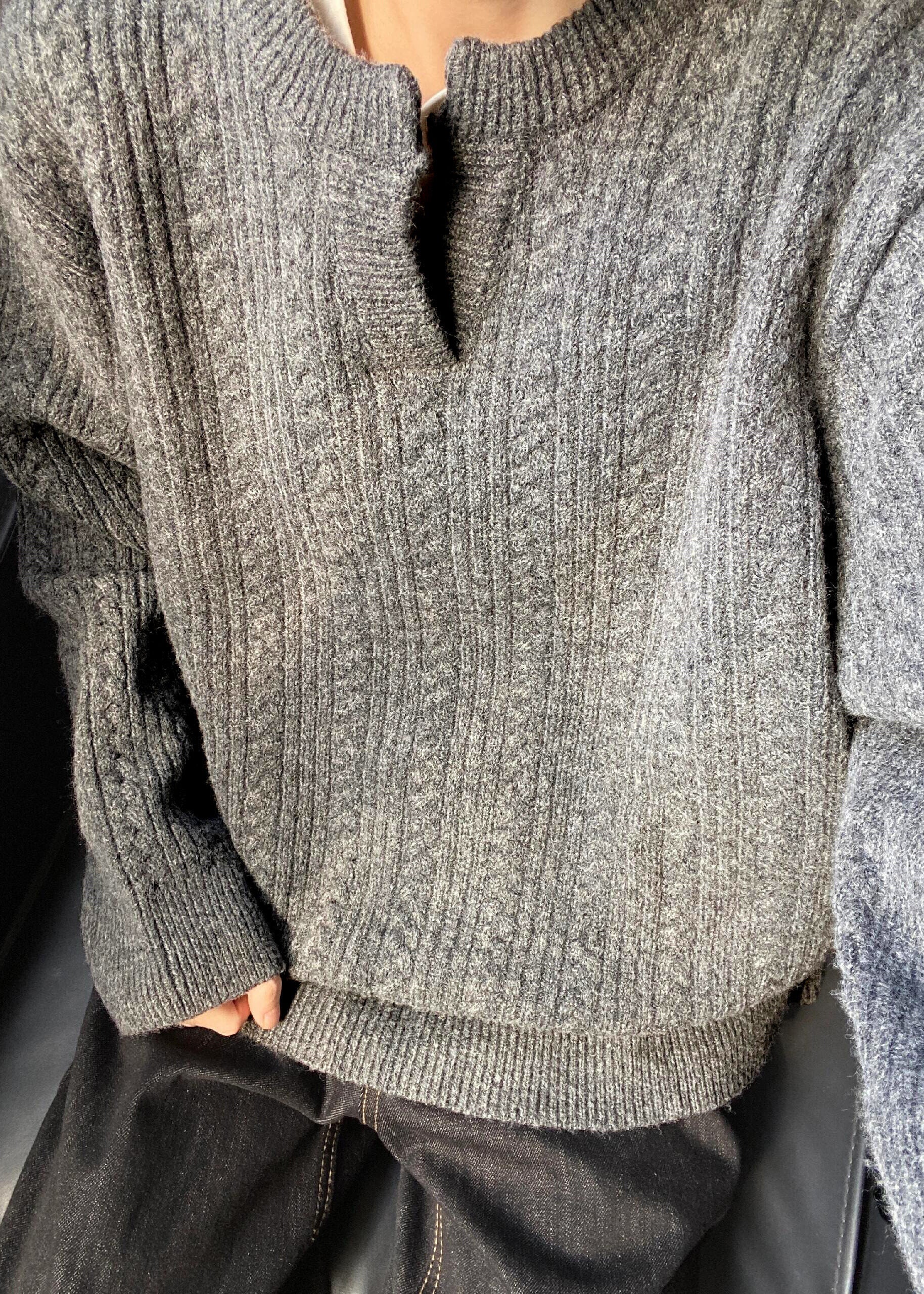 Loose Grey V Neck Cozy Cotton Cable Knit Men Sweater Winter