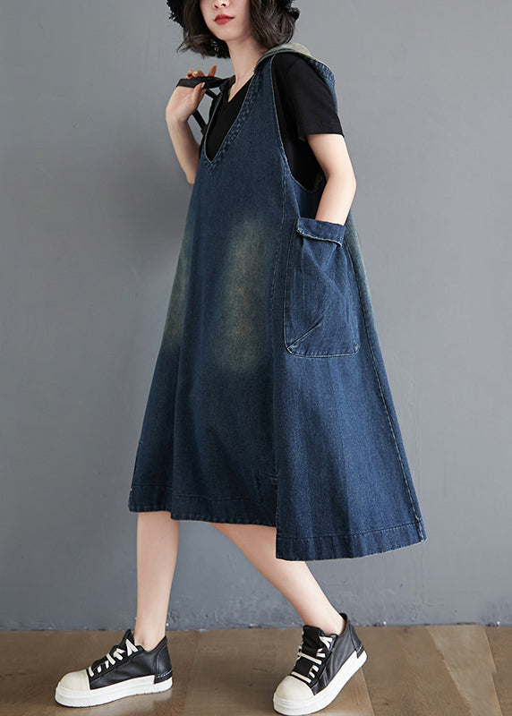 Modern Blue HoodedPockets Patchwork Denim Waistcoat Long Dress Sleeveless
