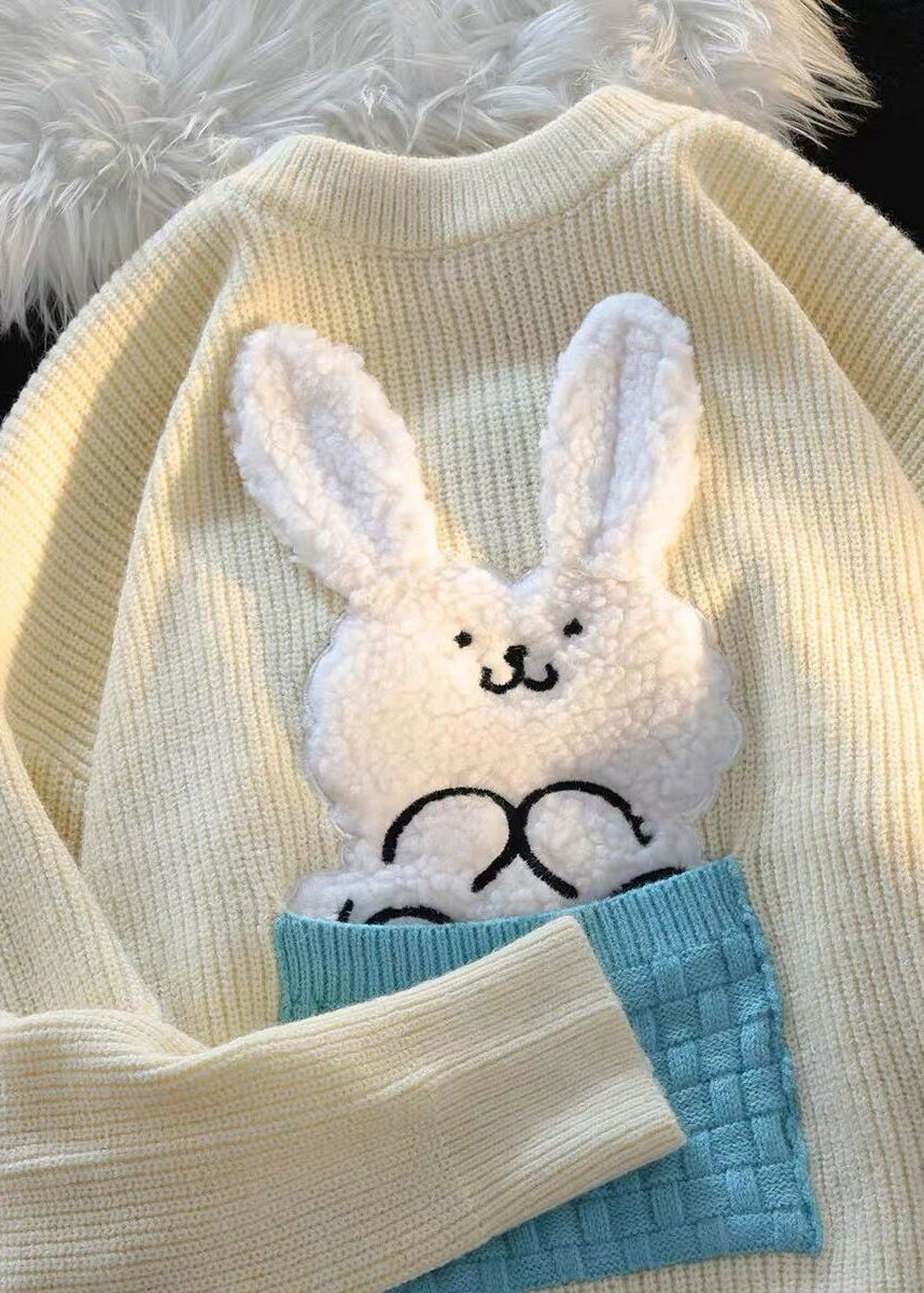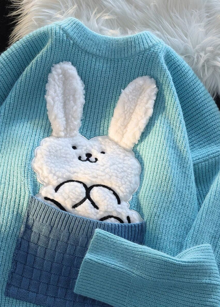 Modern Blue O Neck Character Thick Patchwork Knit Sweater Fall