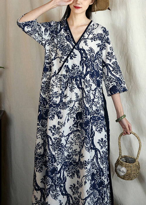New White V Neck Print Patchwork Cotton Long Dresses Bracelet Sleeve
