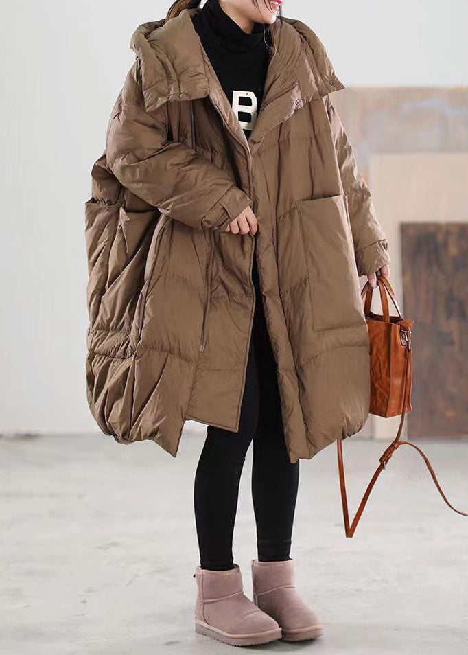 Plus Size Coffee Hooded Zippered Pockets Duck Down Coat Long Sleeve