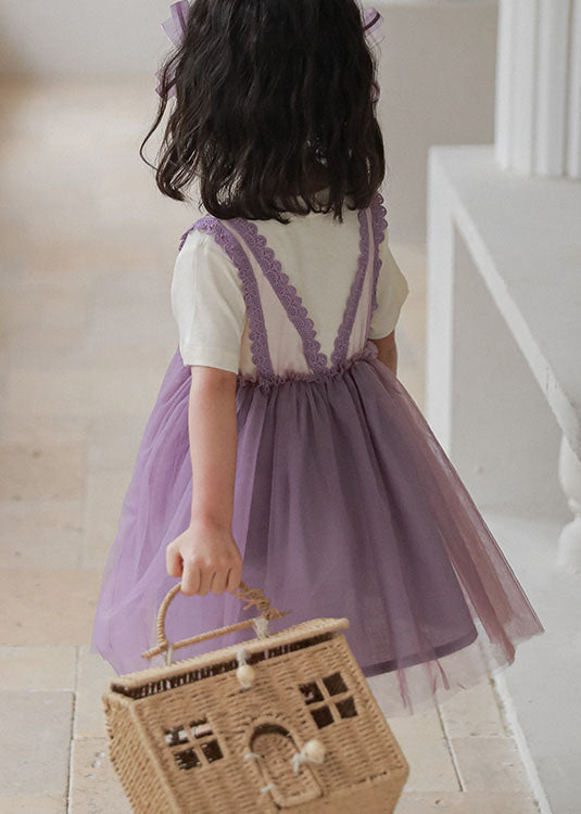Style Purple Wrinkled Lace Patchwork False Two Pieces Tulle Baby Girls Dress Summer