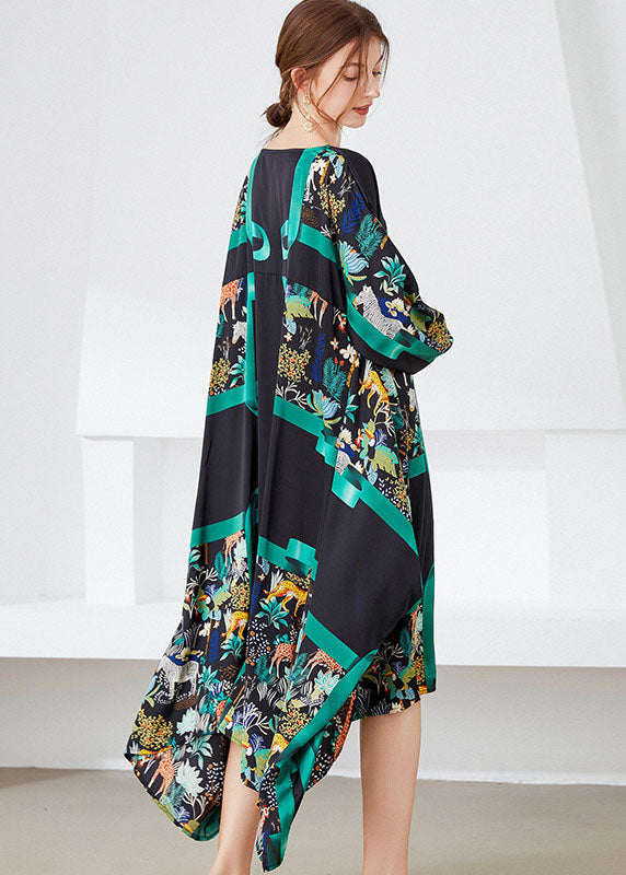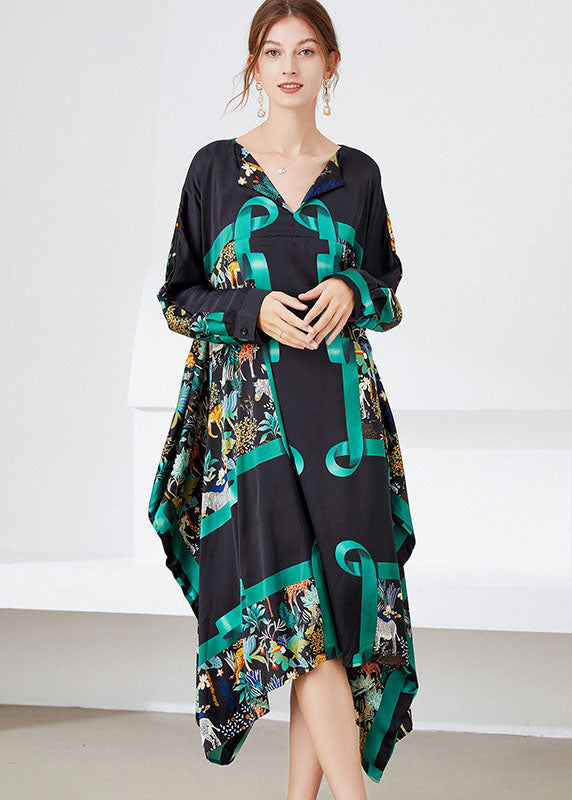 Stylish Black Green Asymmetrical Print Satin Maxi Dress Spring