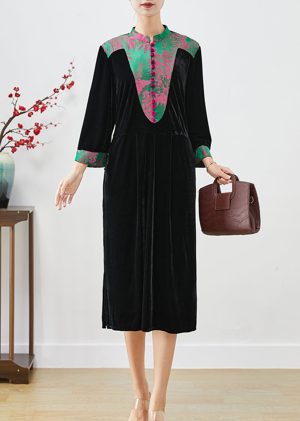 Vintage Black Mandarin Collar Patchwork Silk Velour Dresses Fall