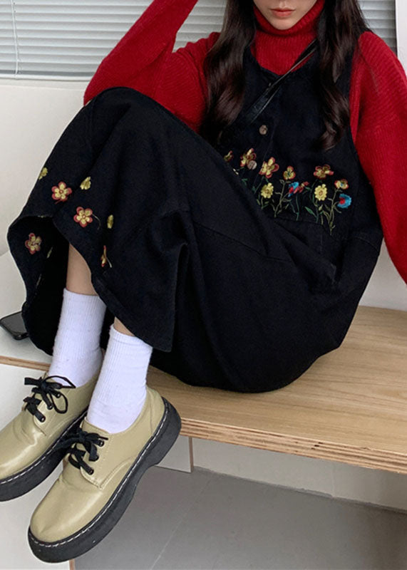 Vintage Black Slash Neck Embroidered Patchwork Button Denim Maxi Dress Sleeveless