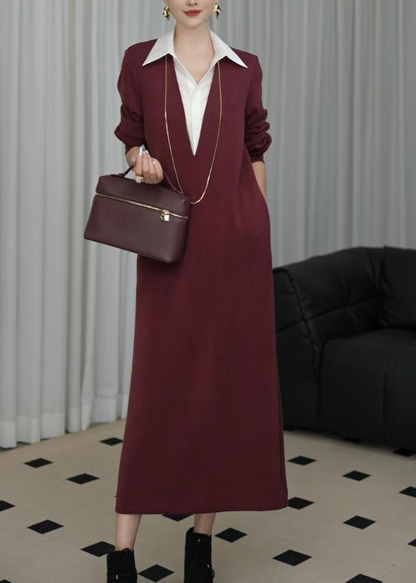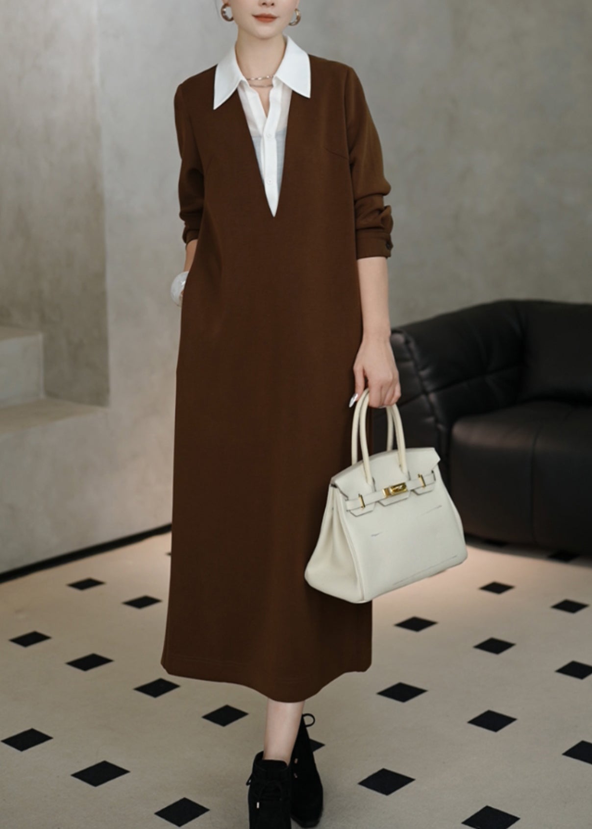 Women Black Peter Pan Collar False Two Pieces Patchwork Cotton Dresses Fall