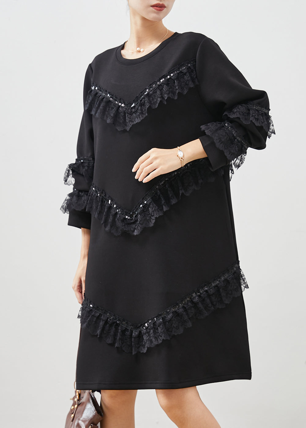 Women Black Ruffles Patchwork Cotton Sweatshirts Dress Spring