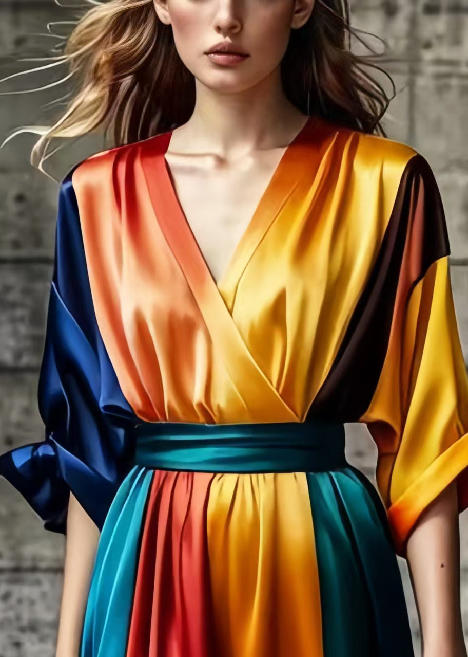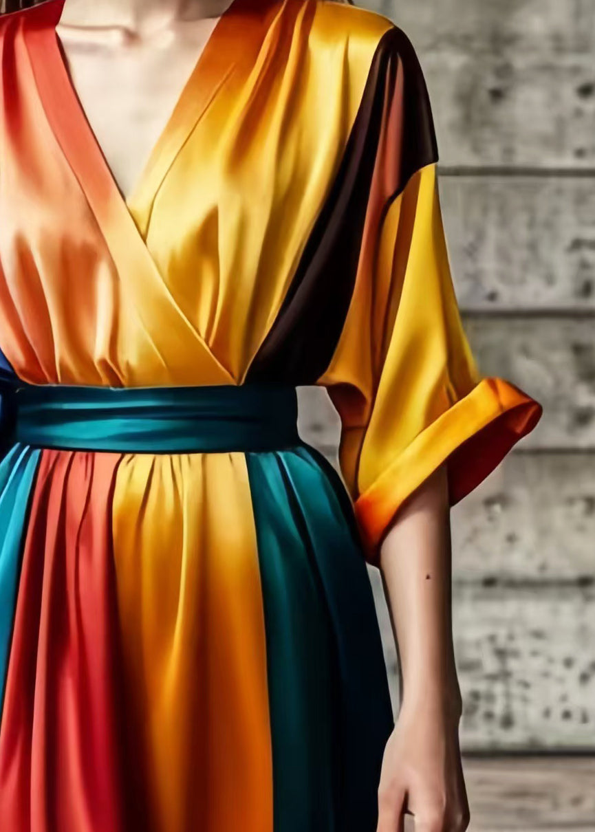 Women Colorblock V Neck Tie Dye Silk Vestidos Dresses Summer