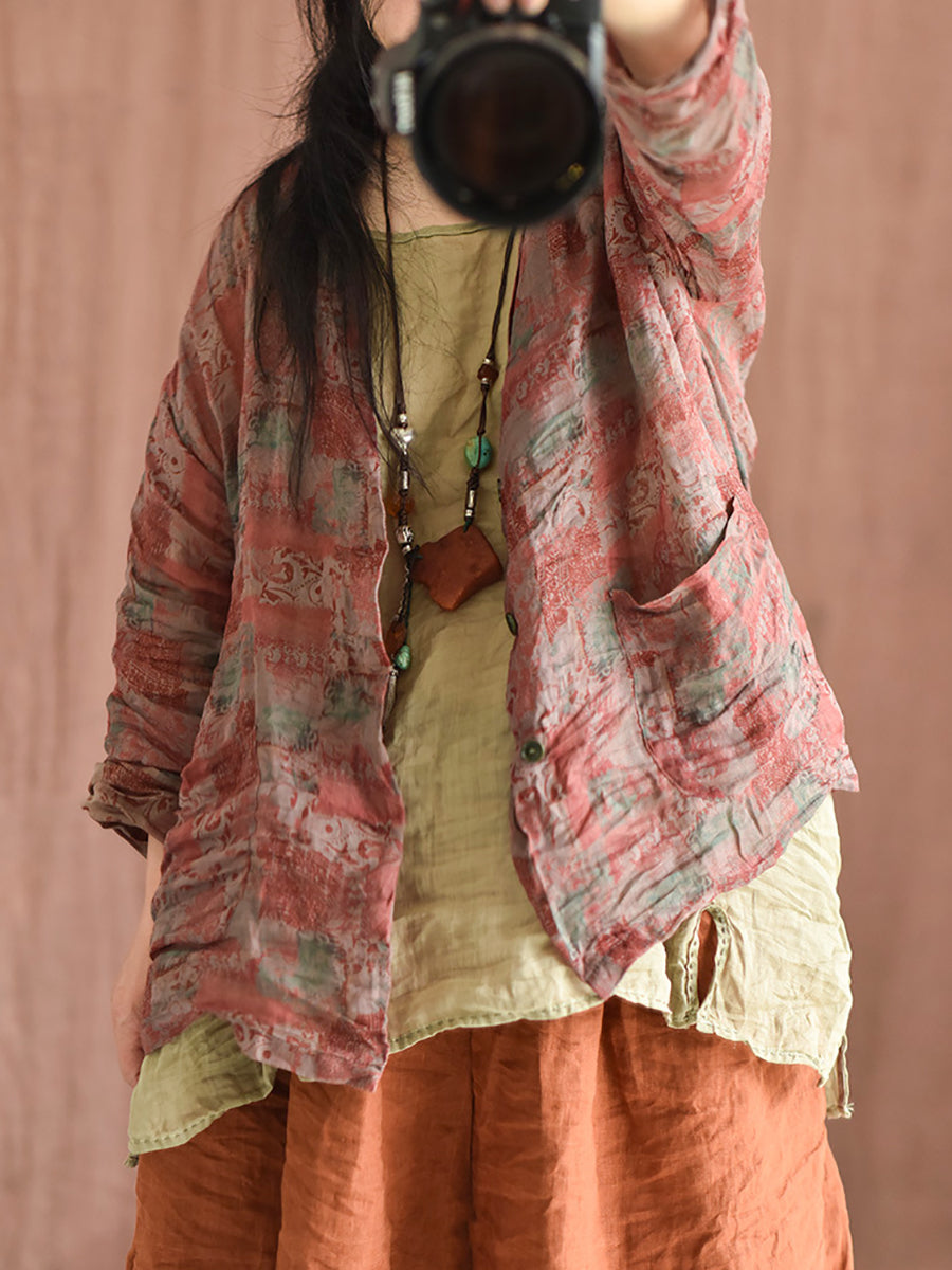 Women Spring Vintage Flower Print Button Thin Ramie Shirt
