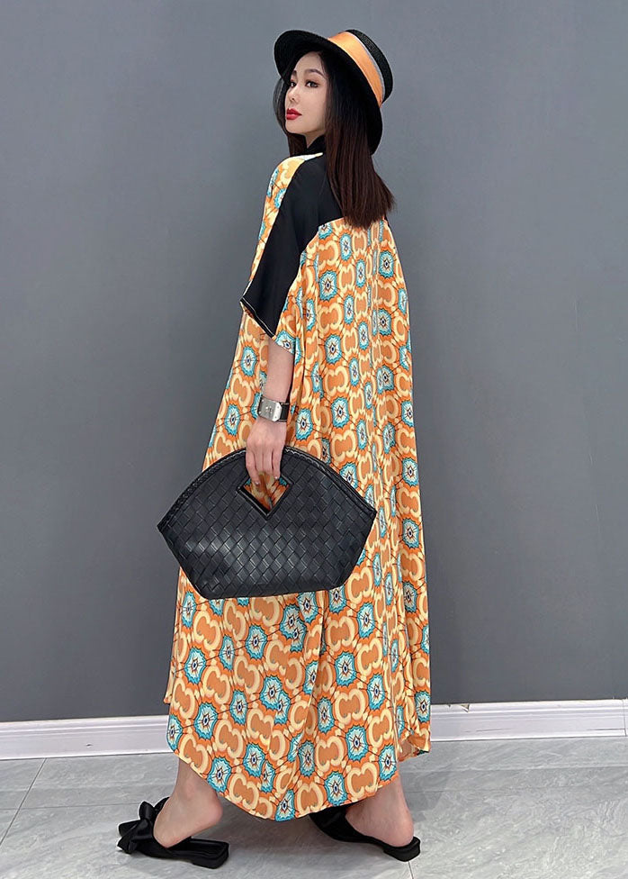 Baggy Orange Peter Pan Collar Print Patchwork Chiffon Vacation Dresses Short Sleeve