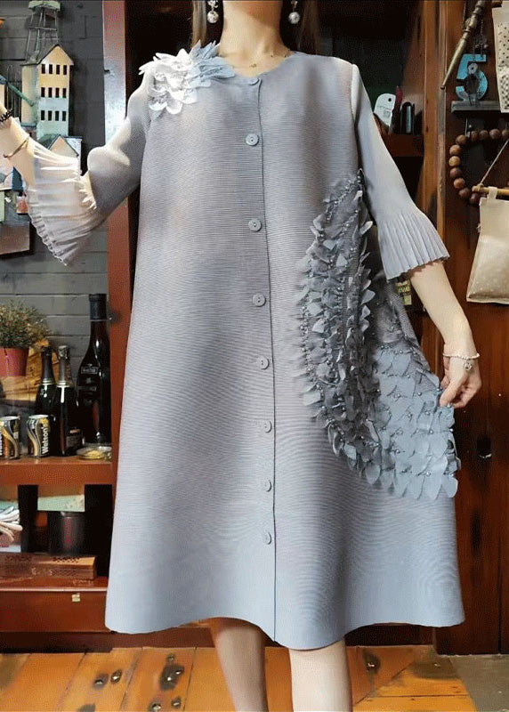 Beautiful Pink O-Neck Nail Bead Floral Button Long Dress Long Sleeve