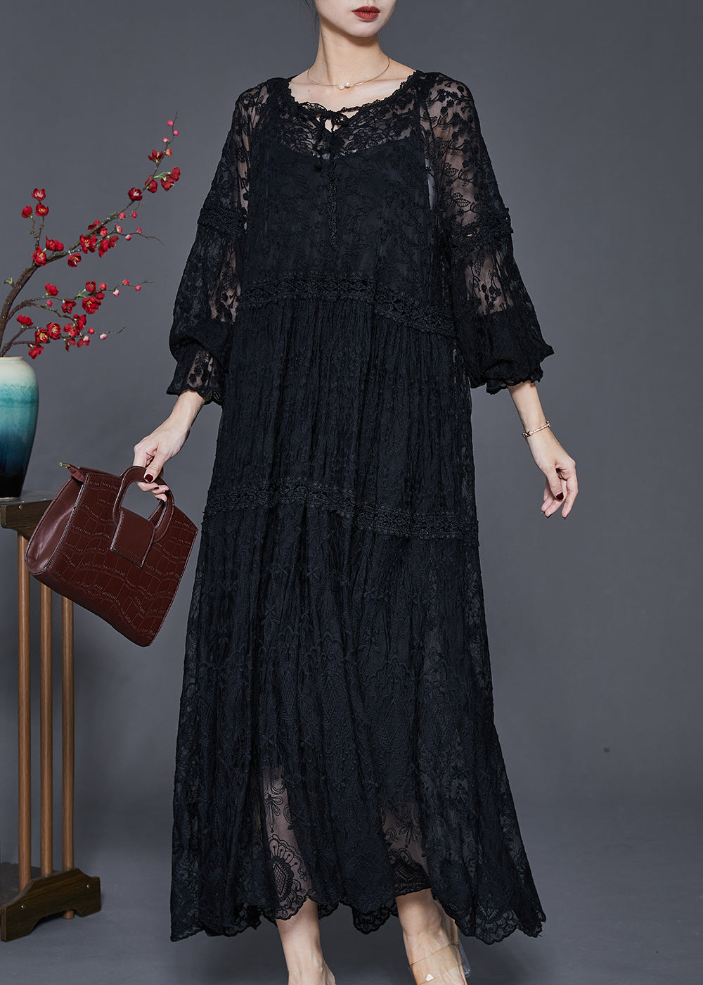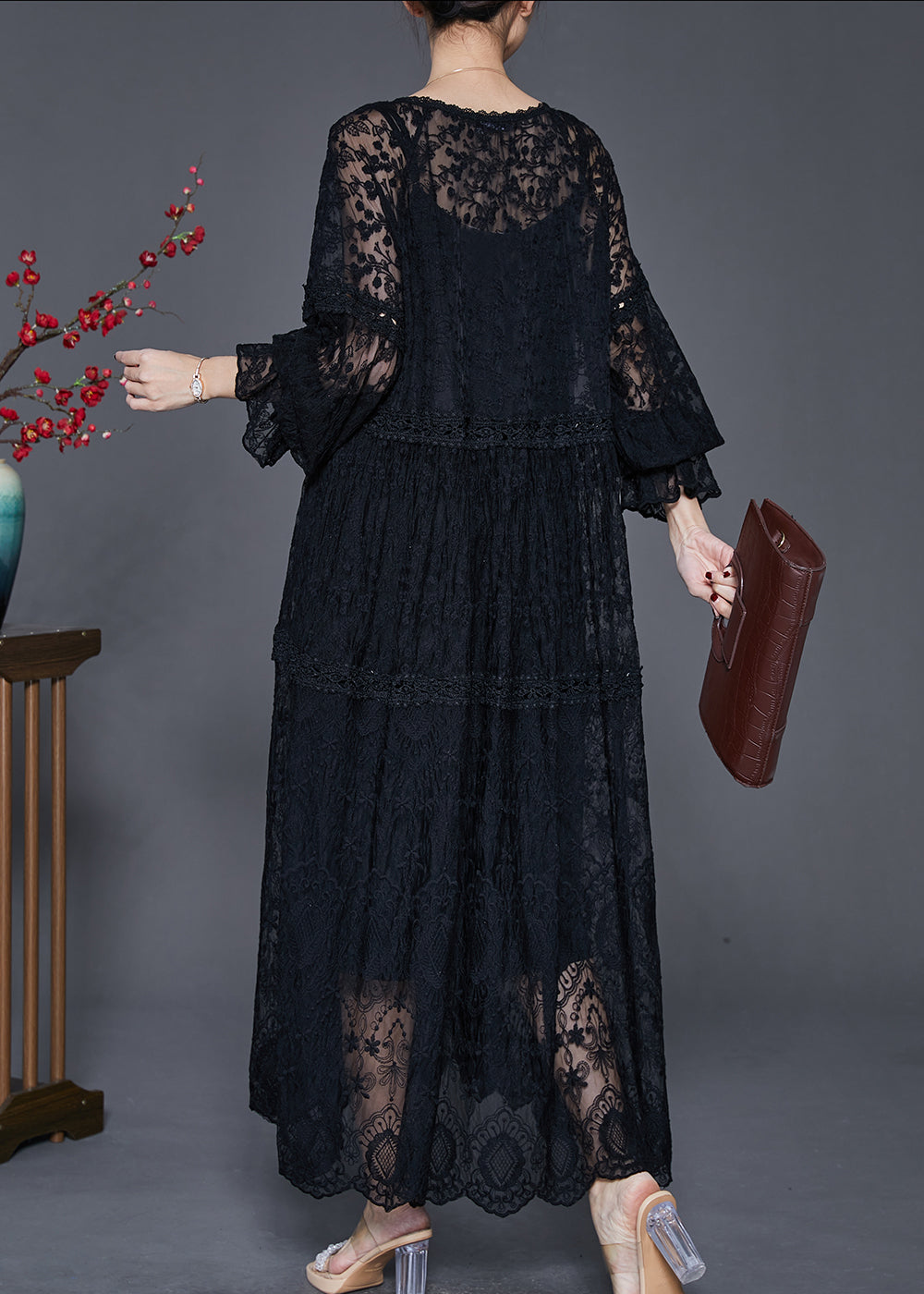 Black Hollow Out Lace Long Dress Two Pieces Set Embroidered Spring