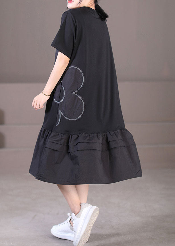 Black Patchwork Cotton Pleated Dress O-Neck Solid Color Short Sleeve
