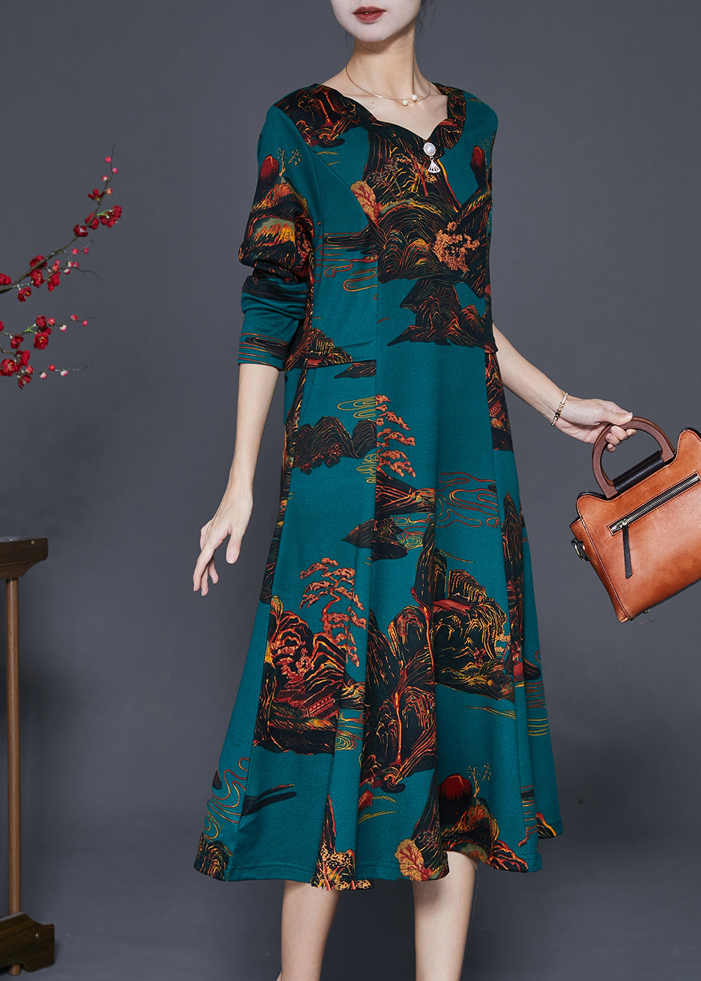Blackish Green Print Silm Fit Cotton A Line Dresses Fall