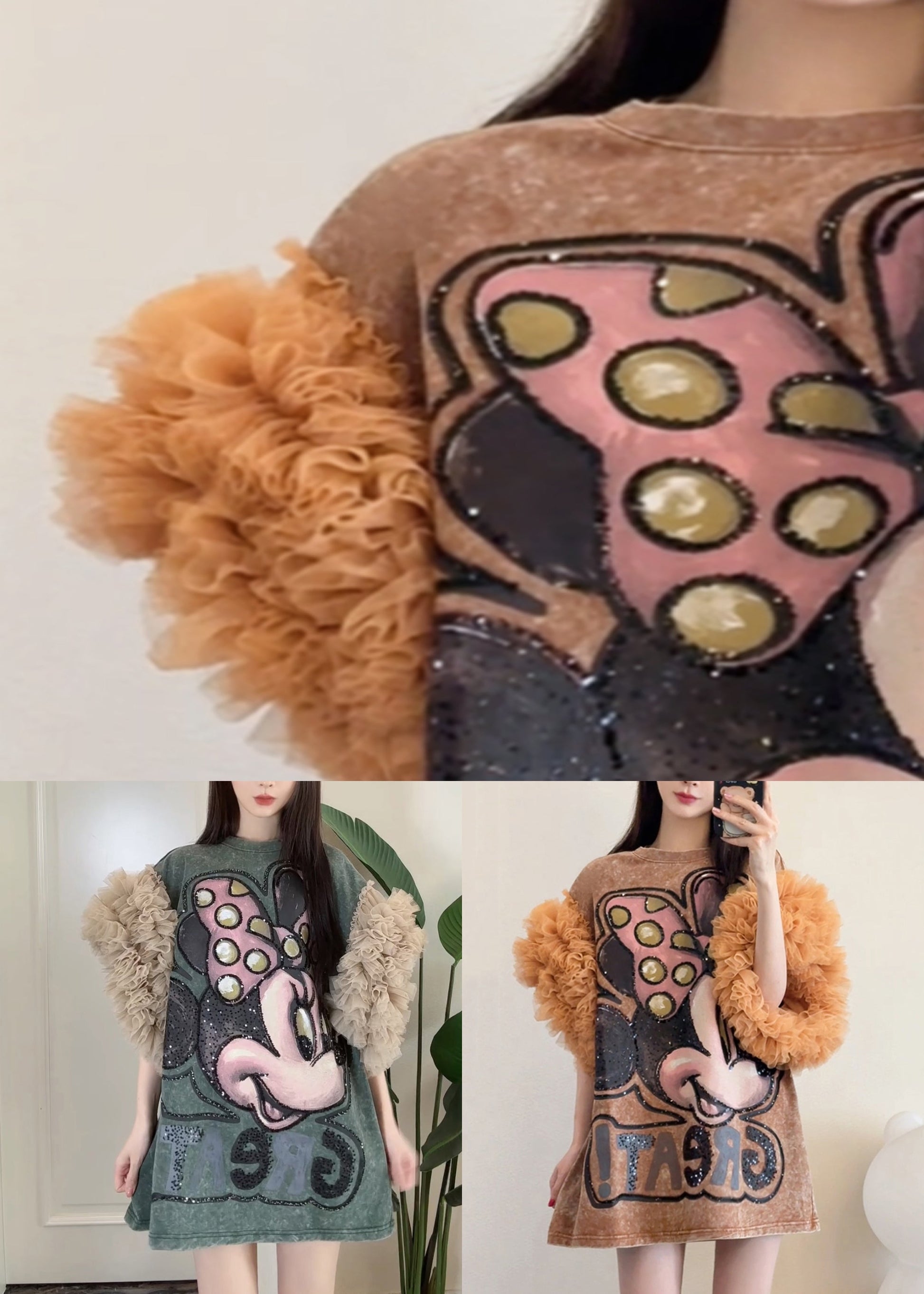 Blackish Green Print Tulle Patchwork Summer T Shirt Dress Ruffled