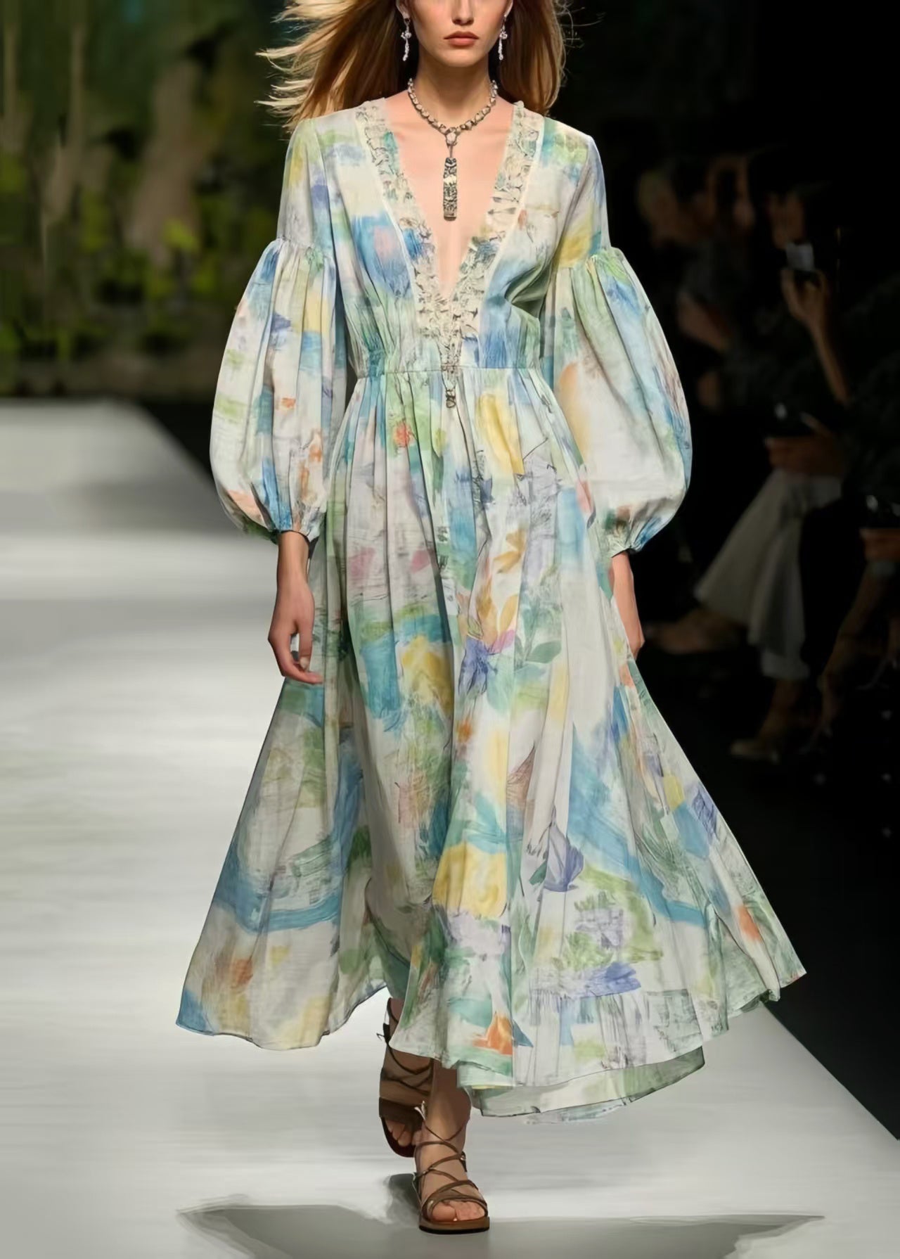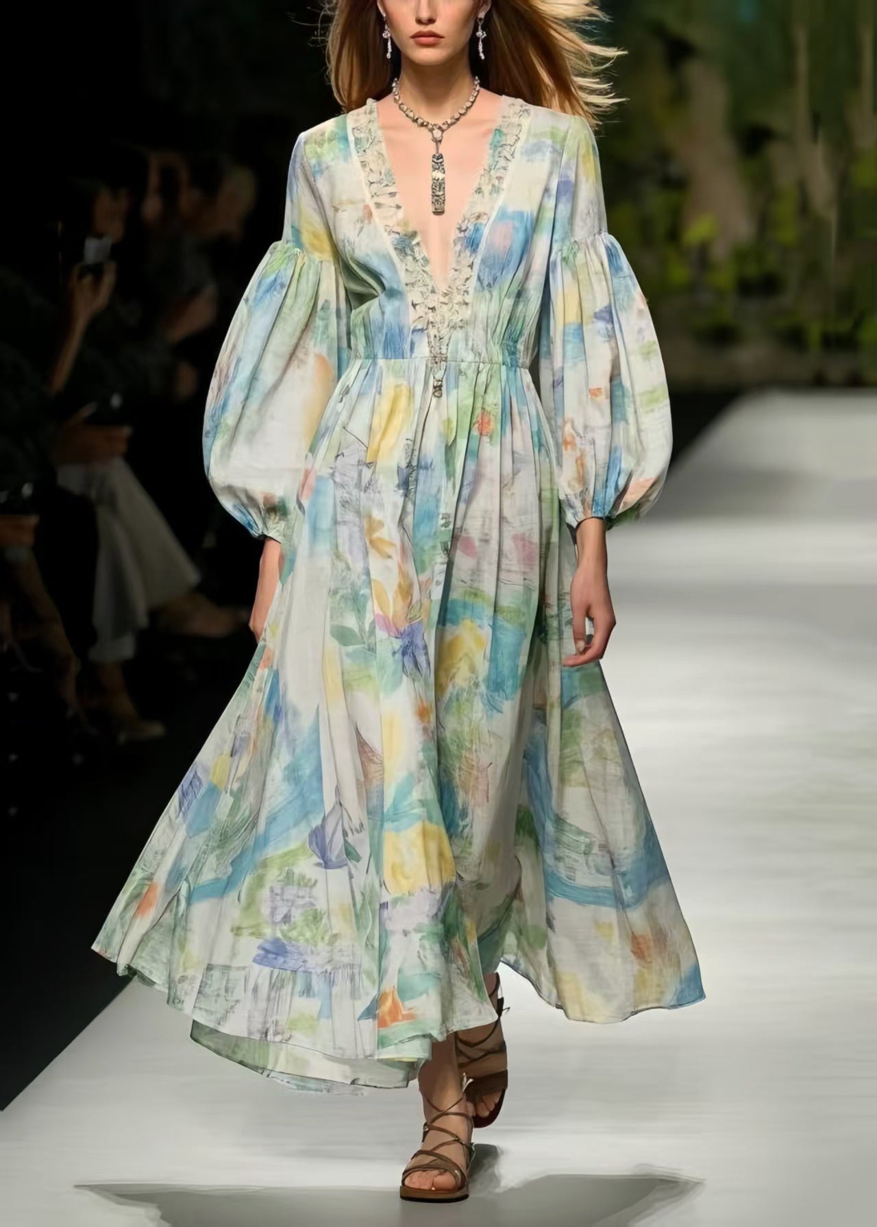 Boho Multicolour Print Exra Large Hem Cotton Dress Puff Sleeve