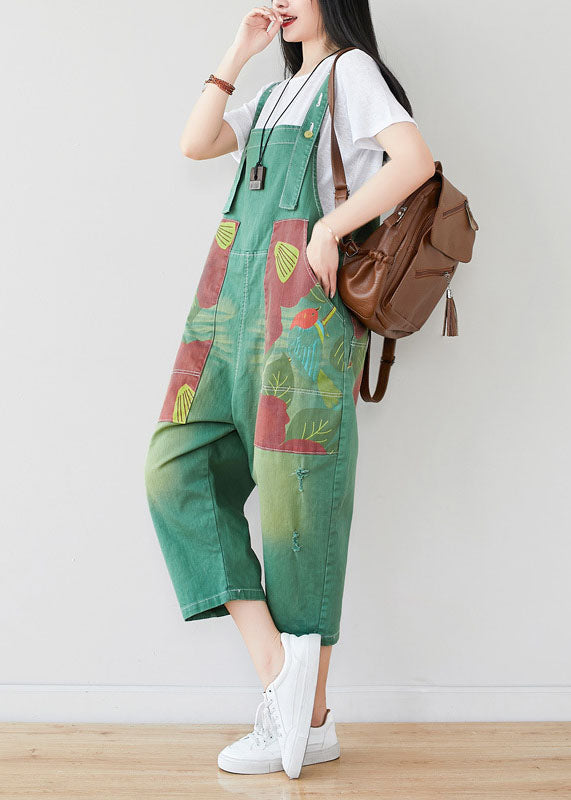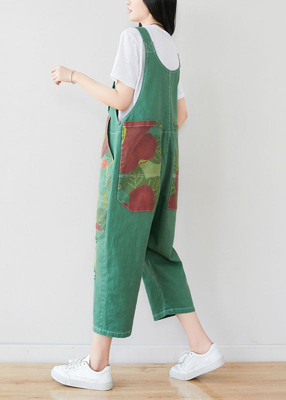 Boutique Green Pockets Patchwork Print Denim Jumpsuits Pants Spring