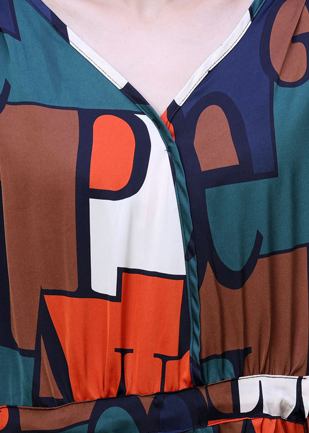 Casual Colorblock V Neck Drawstring Letter Print Chiffon Long Dresses Summer