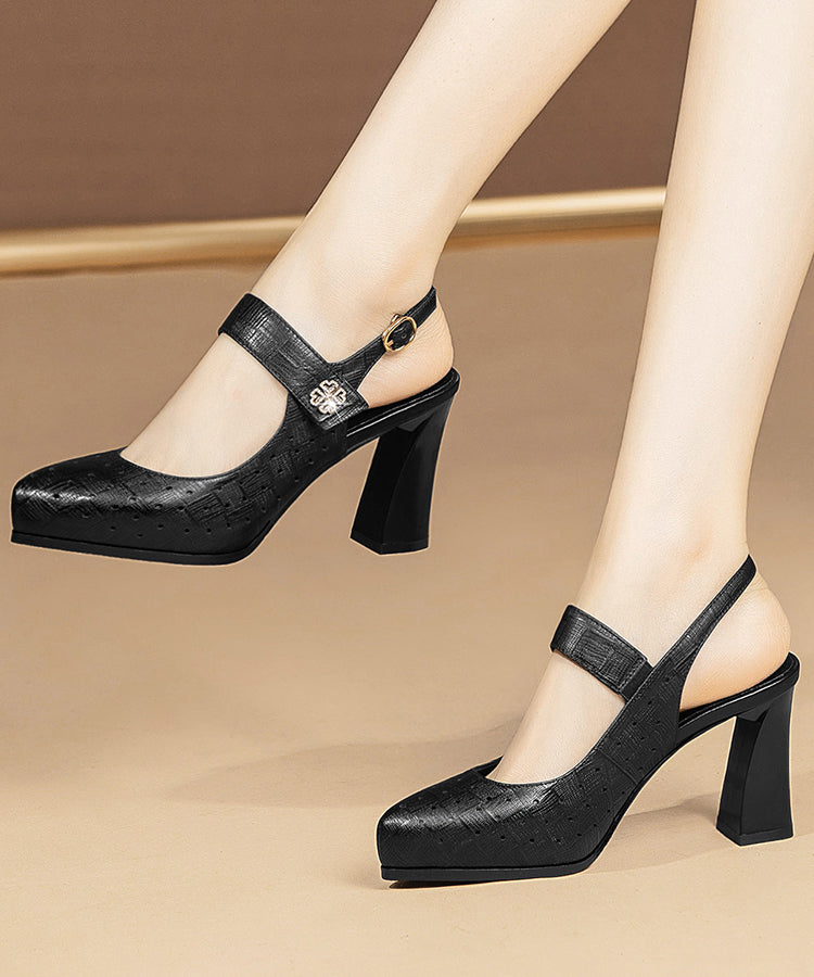 Chic Beige Chunky Heel Cowhide Leather Hollow Out Sandals