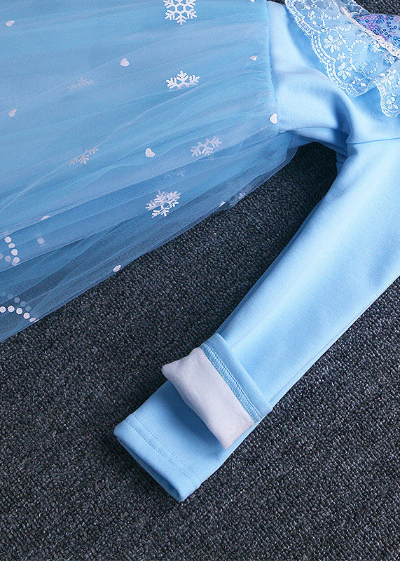 Chic Blue Bow Sequins Patchwork Warm Fleece Baby Girls Dress Winter