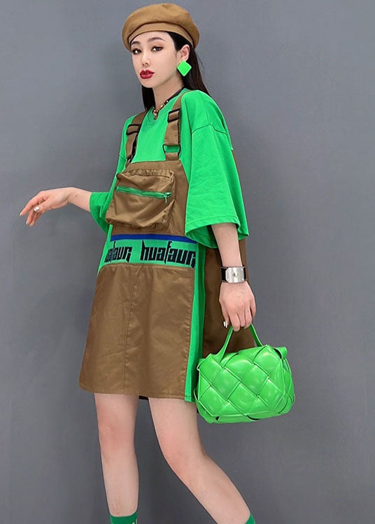 Chic Green O-Neck Patchwork Cotton Fake Two Piece Strap Dress Short Sleeve