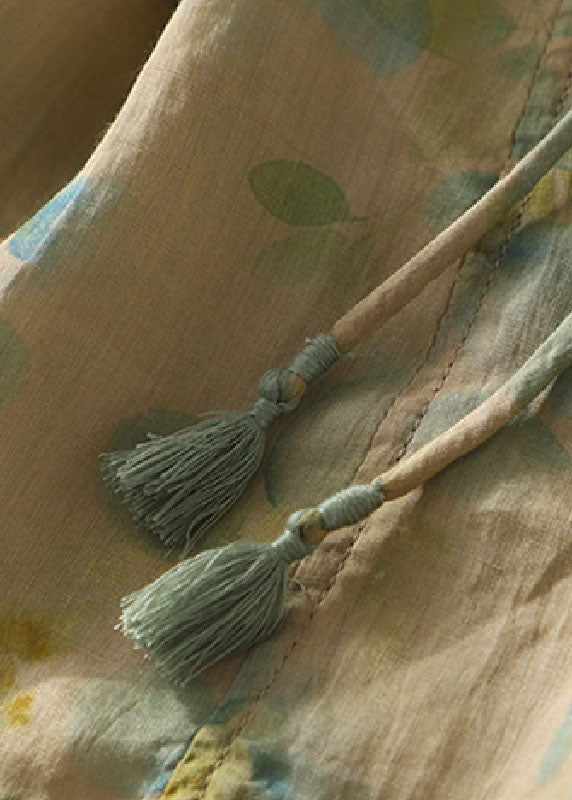 Chinese Style Green Print Tasseled Patchwork Cotton Top Half Sleeve