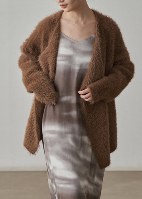 Coffee Chunky Mink Hair Knitted Cardigan V-Neck Long Sleeve