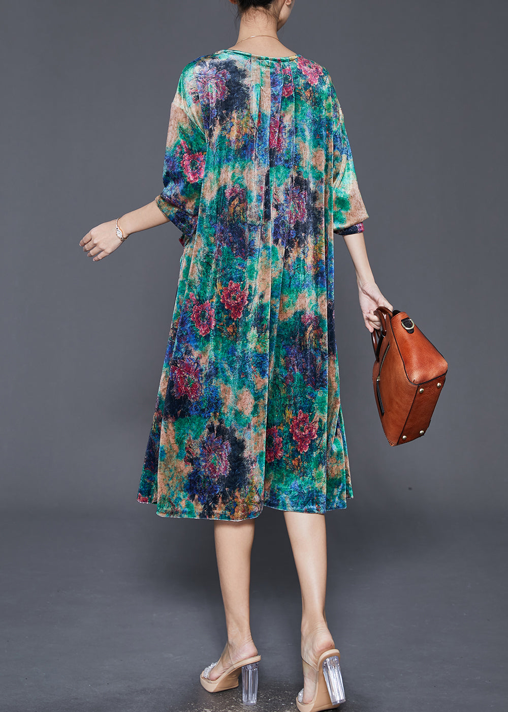 DIY Peacock Green Oversized Print Silk Velour Mid Dress Fall