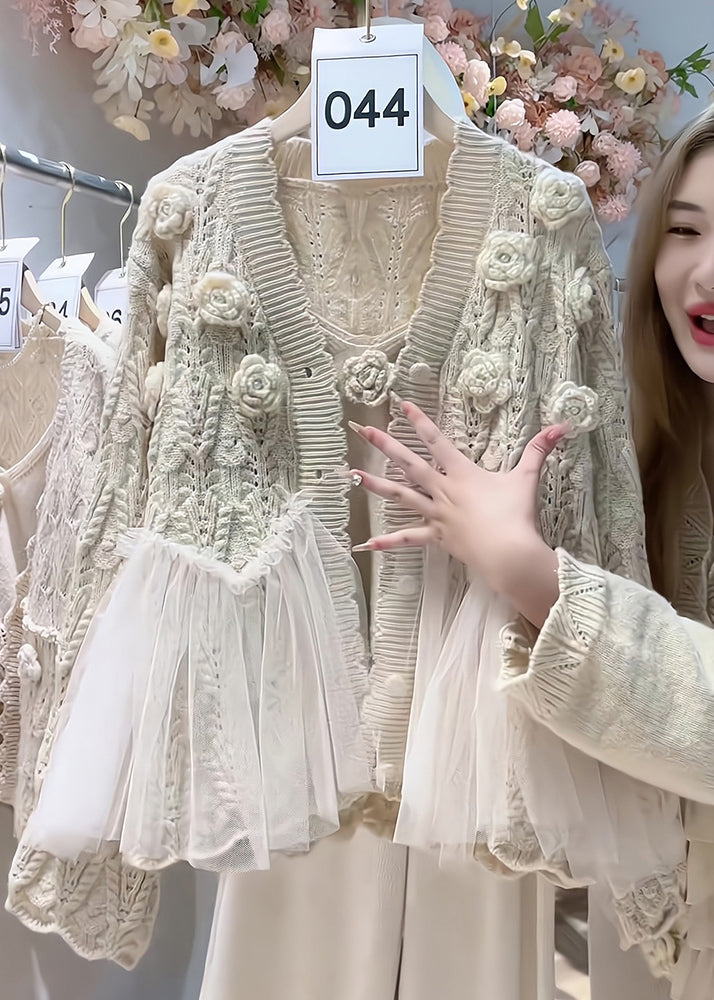 Elegant Beige Flower Tulle Patchwork Knit Cardigan Two Piece Set Spring