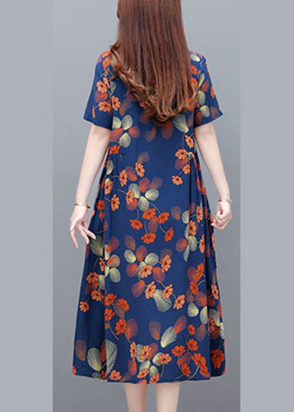 Elegant Blue O-Neck Wrinkled Print Cotton Cinch Dresses Short Sleeve
