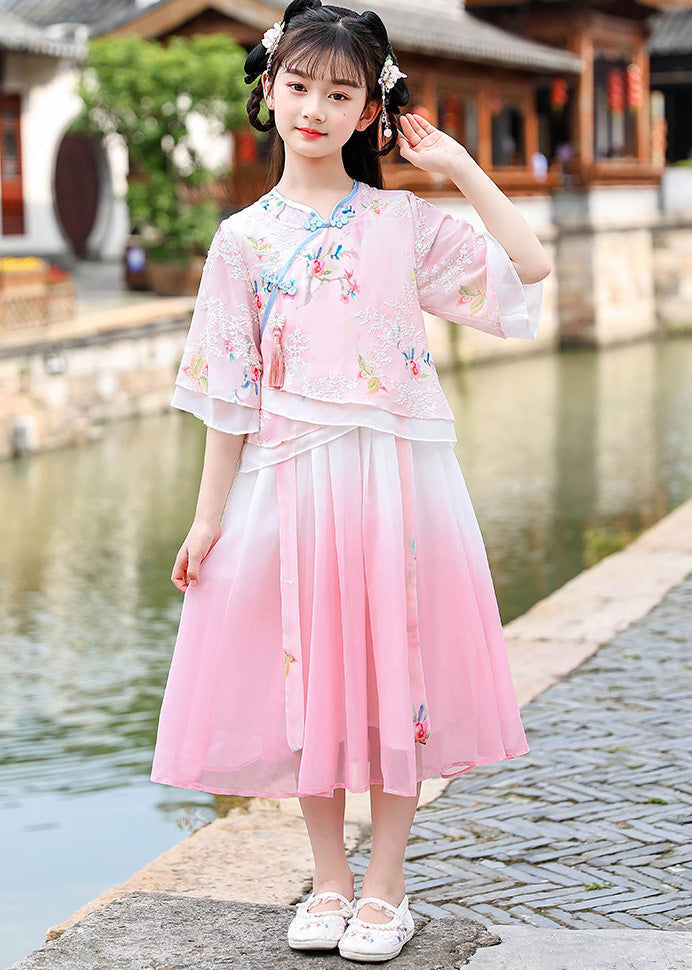 Elegant Pink Embroideried Patchwork Tassel Chiffon Girls Long Dresses Short Sleeve