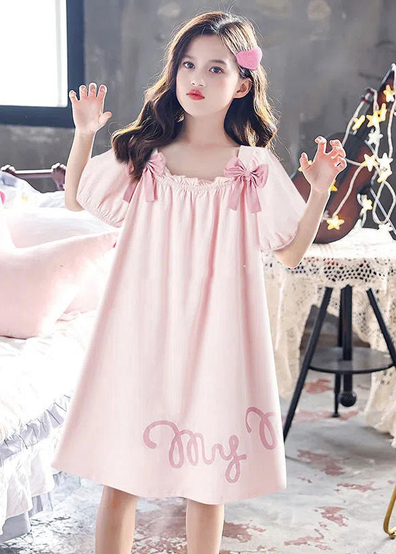 Elegant Pink Wrinkled Graphic Bow Cotton Girls Maxi Dress Short Sleeve