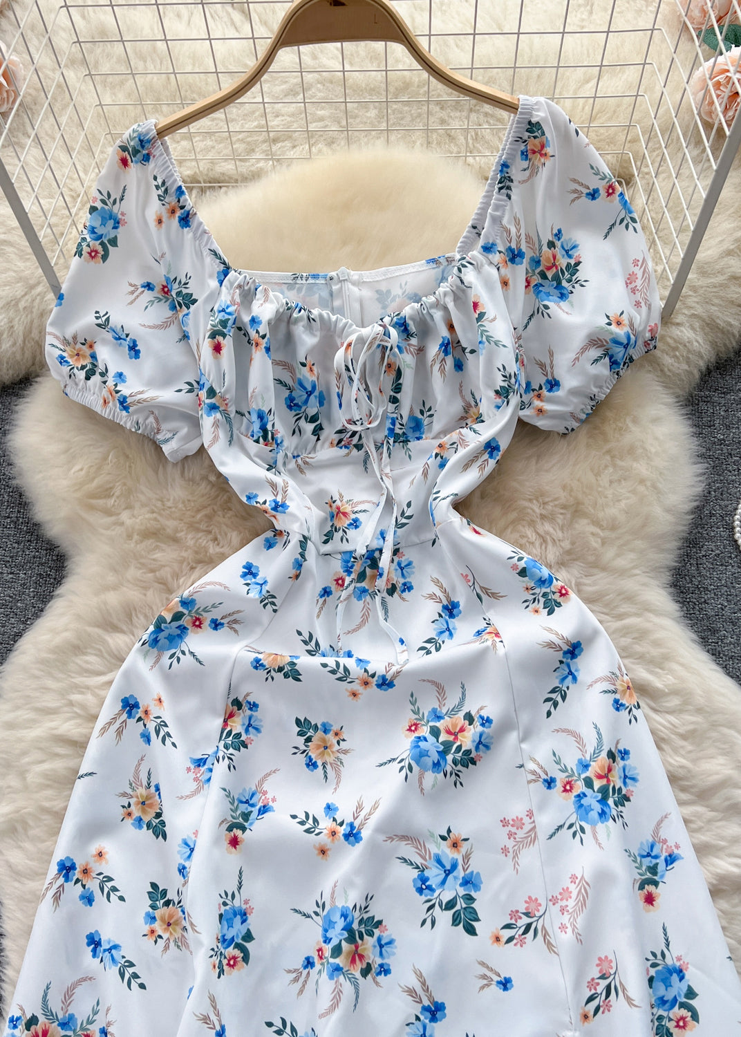 Elegant White Lace Up High Waist Cotton Dresses Short Sleeve