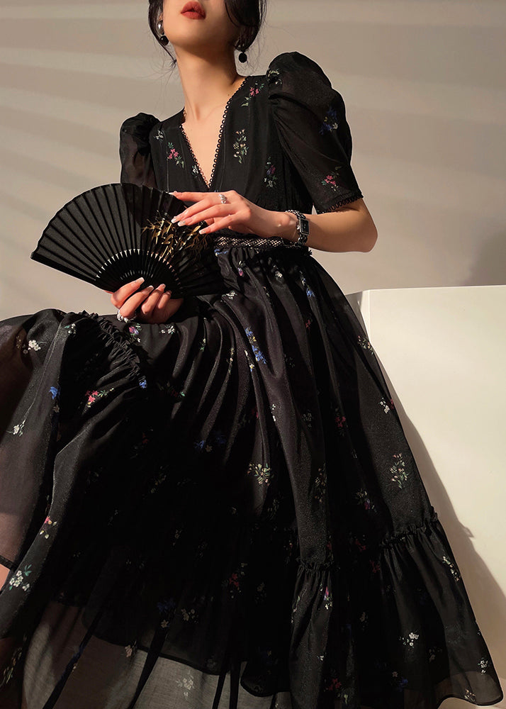 Fashion Black V Neck Zippered Print Chiffon Maxi Dresses Lantern Sleeve