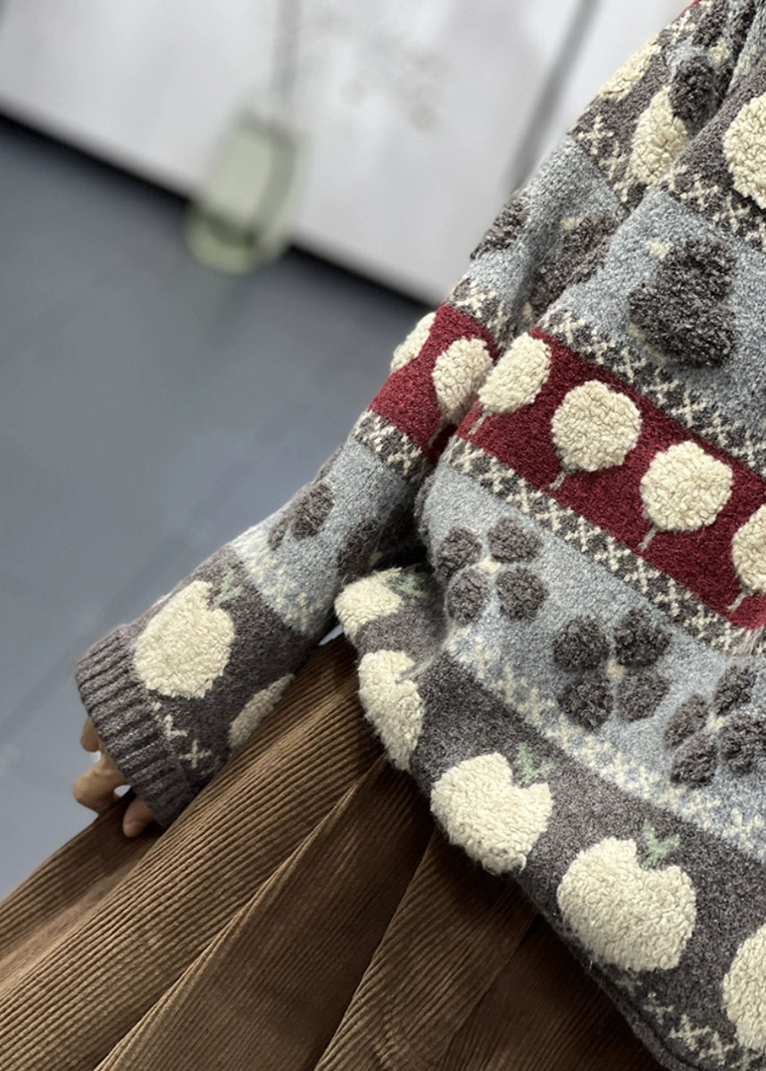 Floral Grey O Neck Patchwork Cozy Cotton Knit Sweaters Long Sleeve