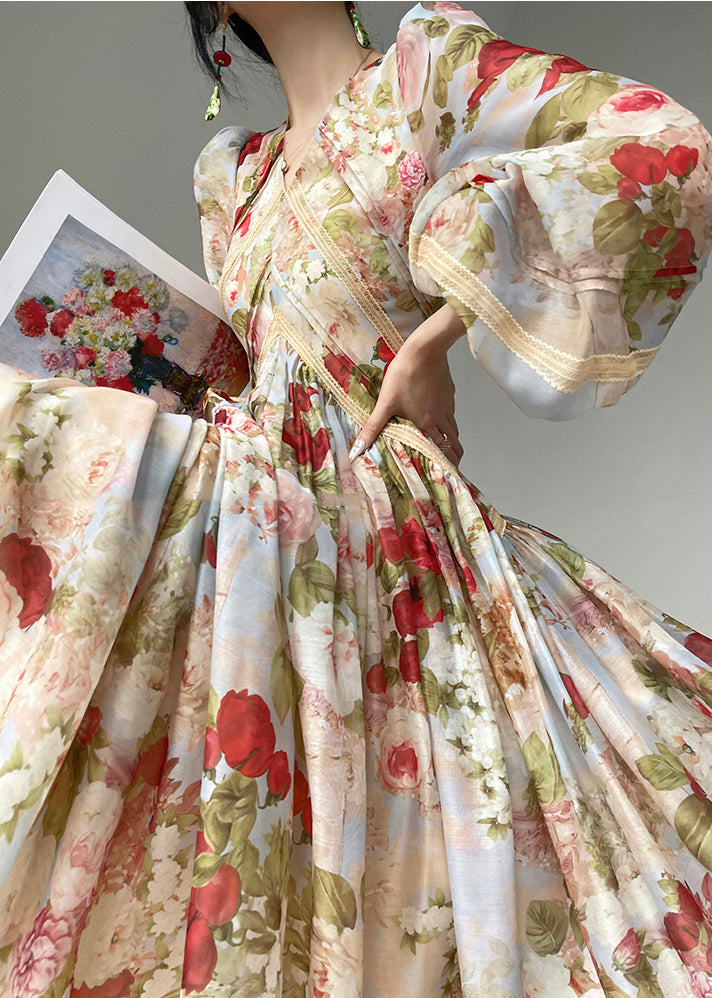 French Apricot Flower Print Silk Evening Dresses Lantern Sleeve