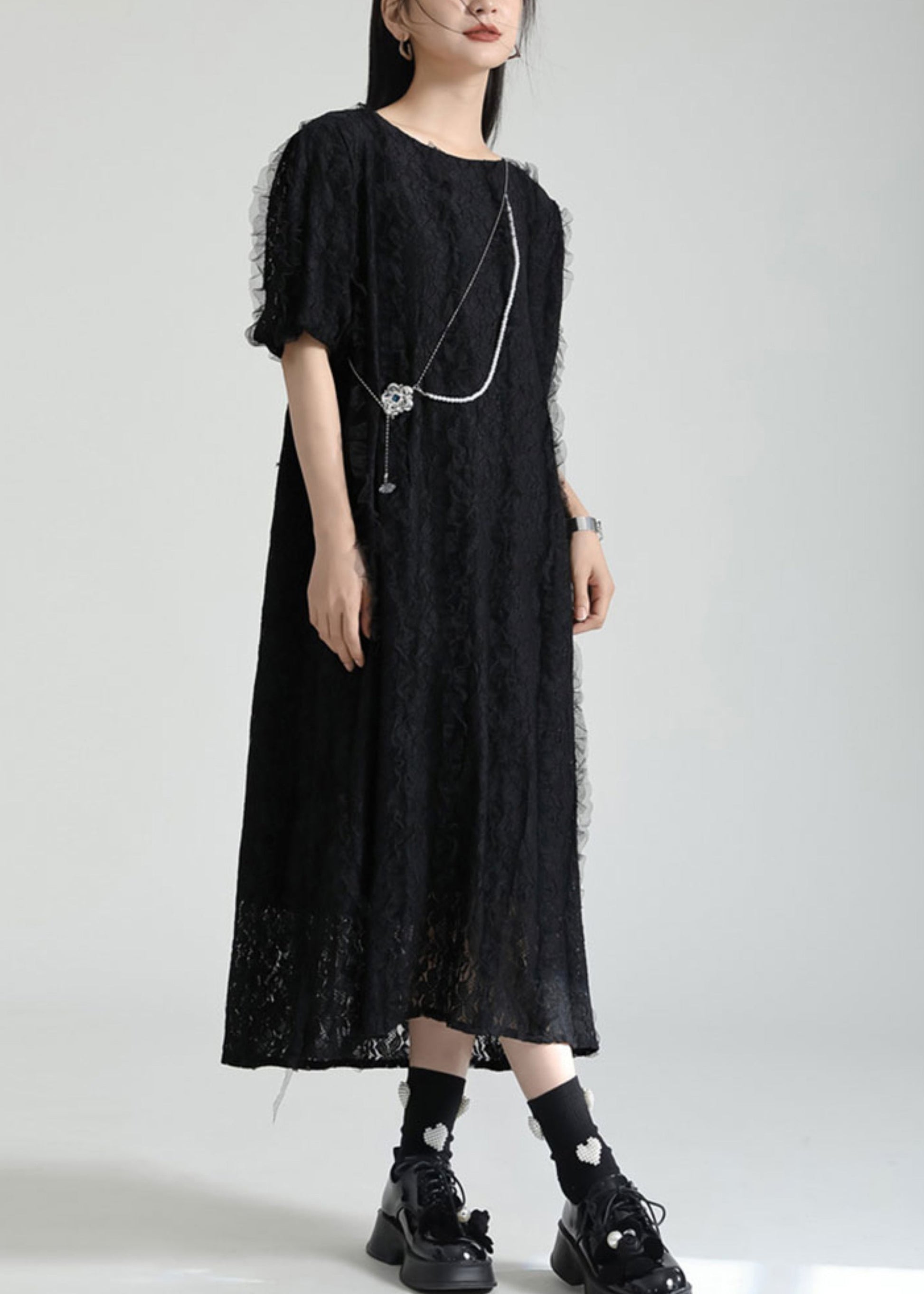French Black O Neck Patchwork Lace Dresses Summer
