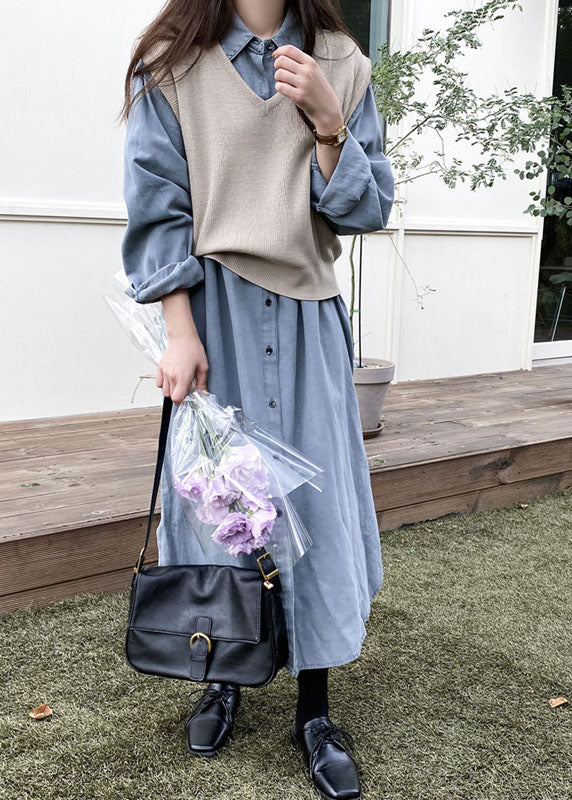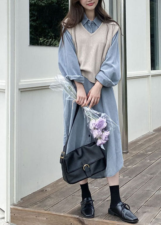 French Blue Peter Pan Collar Denim Shirts Dress And Vest Two Pieces Spring